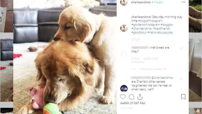 Due to the glaucoma, an eye disease, lost eleven-year-old Charlie three years ago, his left eye. Only a year later, the Golden Retriever also got pain in the right eye and went blind completely. But his owner probably thought the same: What people in such a Situation, helps, works well in dogs. They organised a Maverick, a Golden Retriever puppy as a guide dog for their blind dog.