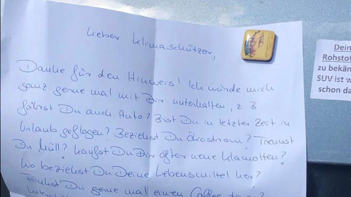 The complete counter in the wording: “Dear climate activists, thank you for the note. I would talk to you, and very happy times with you, for example: Driving you car? You flew in the last time in the holiday? Are you referring to green electricity? You can separate all the garbage? You buy more new clothes? Where do you get your food? You like to drink a Coffee-to-go? You support a club that’s doing for the environment? You plant on your balcony flowers … Write me your phone number. I would be happy with you about this subject.“